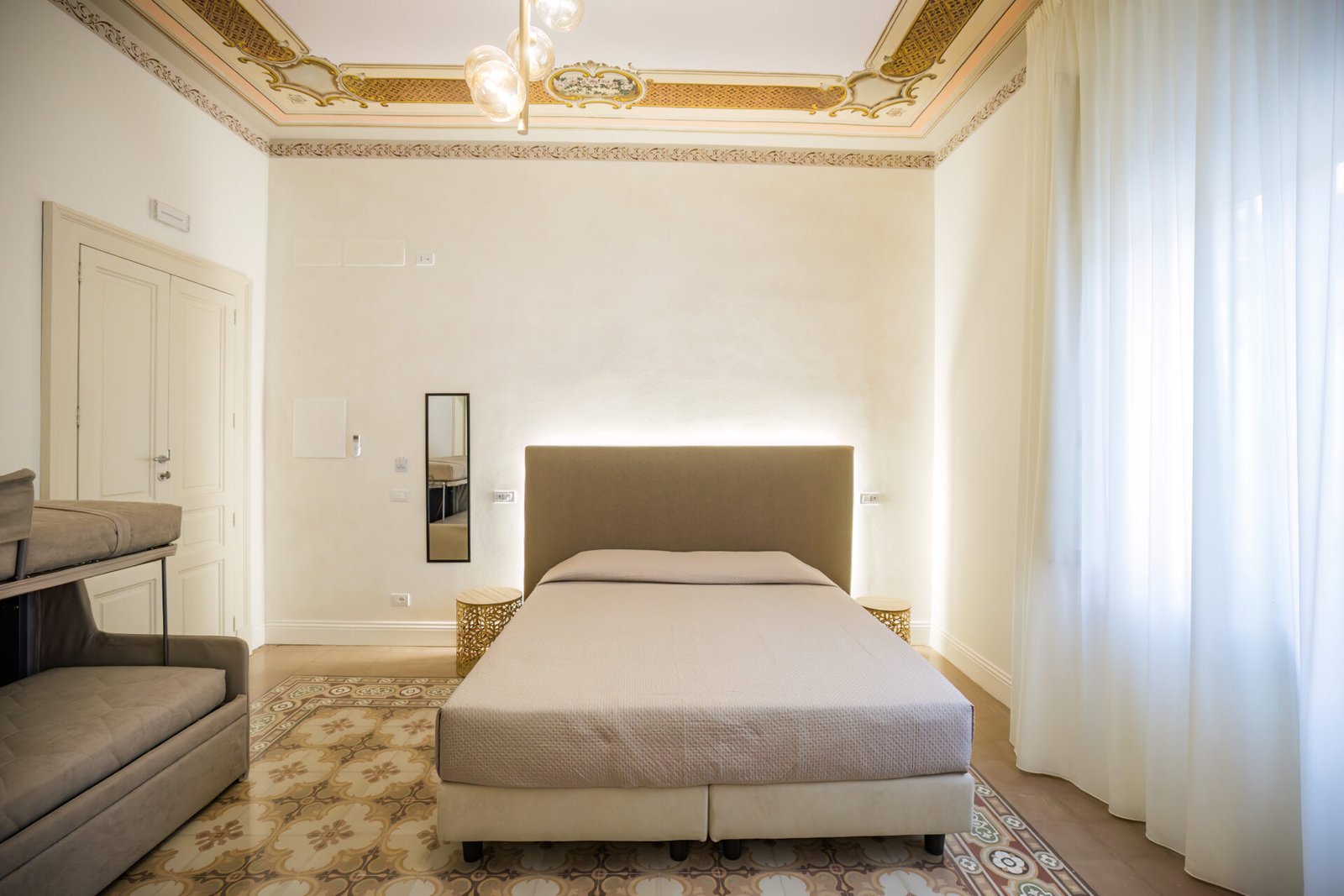 L’ambiente è curato nei dettagli, con arredi moderni, inseriti nel contesto classico. La camera grazie alla finestra e alla portafinestra si riempie di luce naturale. Perfetta per coppie in cerca di relax o piccoli nuclei familiari.